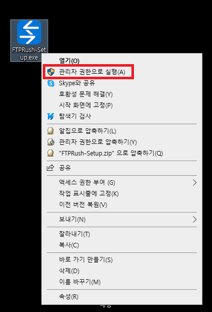 5. FTPRush-Setup.exe 파일을 우클릭하여 관리자 권한으로 실행해줍시다.