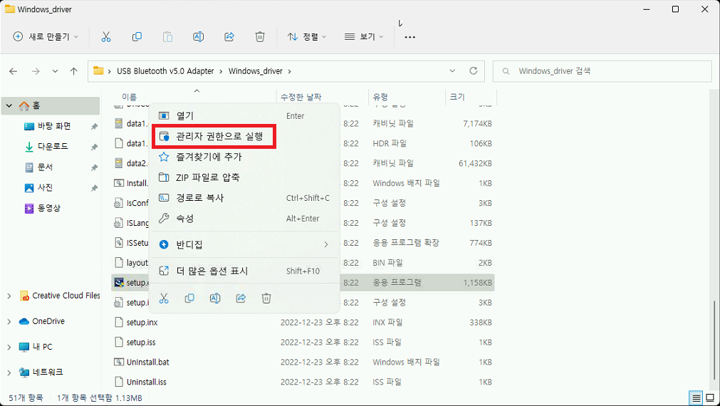 4. setup.exe 파일을 찾으셨다면 마우스 우클릭하여 관리자 권한으로 실행해줍시다.