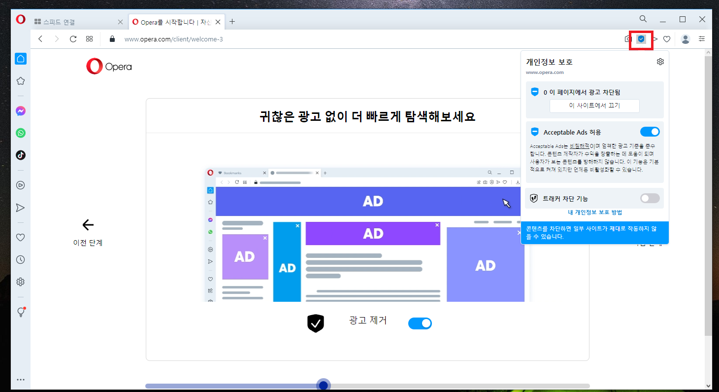 Opera Browser는 기본적으로 브라우저 내에 VPN 기능과 광고 제거 플러그인이 내장되어있습니다.