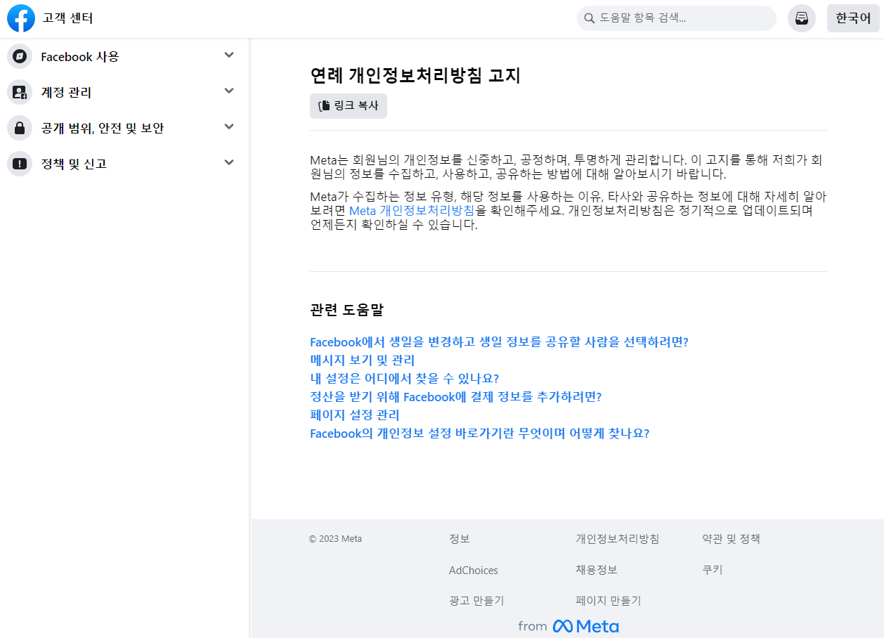 연례 개인정보처리방침 고지 | Facebook 고객 센터