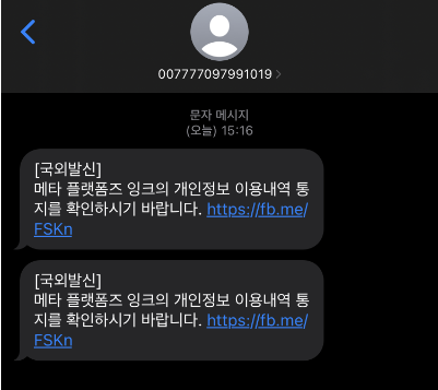 메타 플랫폼즈 잉크의 개인정보 이용내역 통지 확인 문자메시지