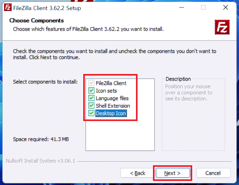 13. 파일질라 클라이언트의 컴포넌트를 같이 설치될때 추가하거나 뺄 수 있습니다.