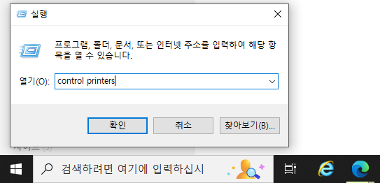 2. control printers를 입력하고 확인을 눌러줍시다.