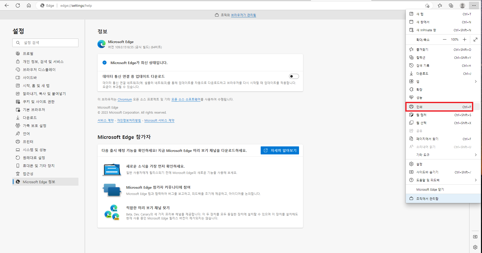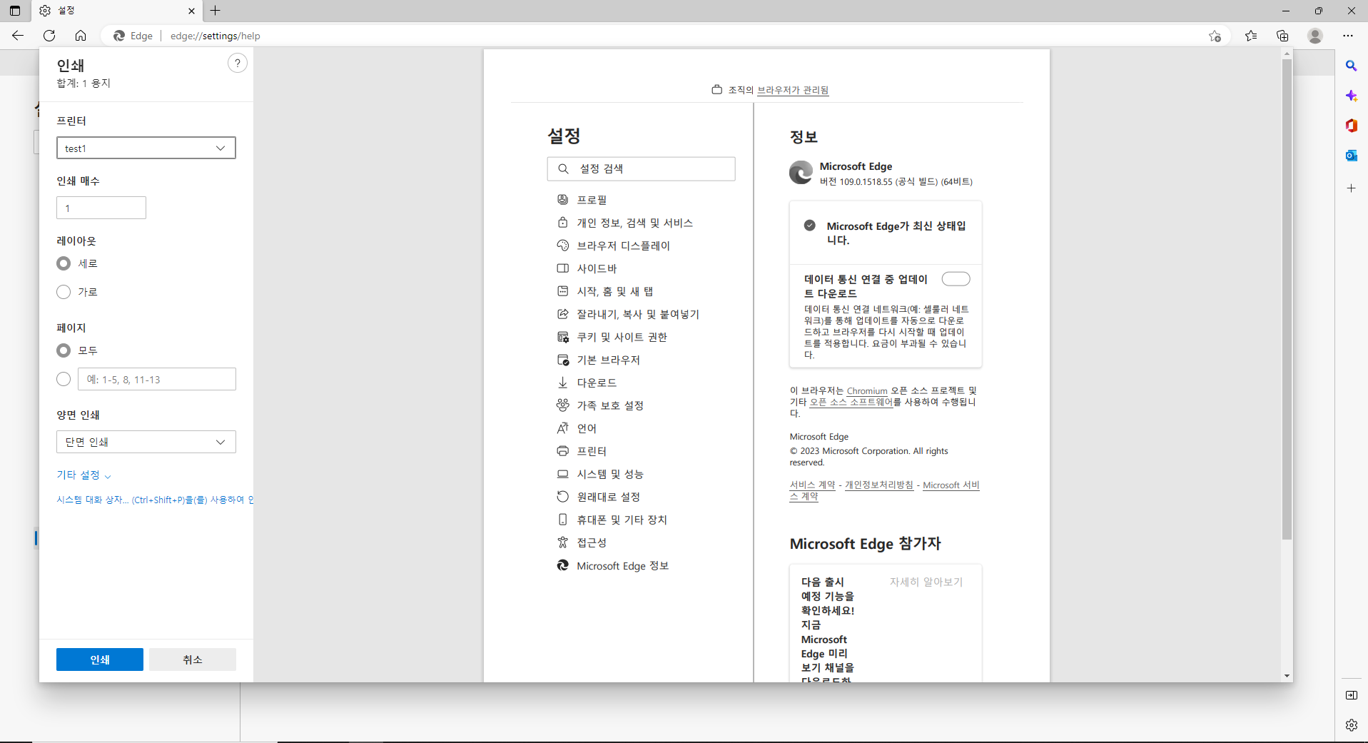 마이크로소프트 엣지 109.0.1518.55 빌드 버전 업데이트 후 브라우저에서 인쇄 누르면 무한 로딩 걸리는 문제가 발생하고 있습니다.