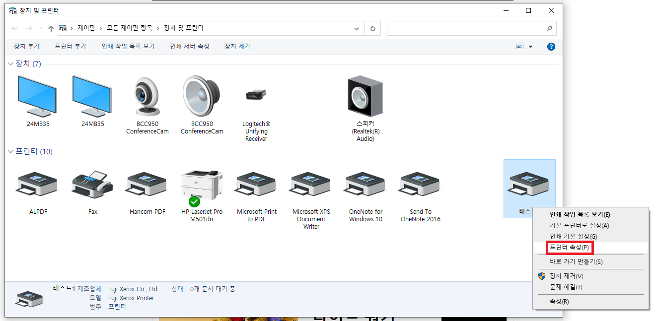 4. 한글로 되어있는 프린터를 마우스 우클릭하셨다면 프린터 속성을 눌러줍시다.