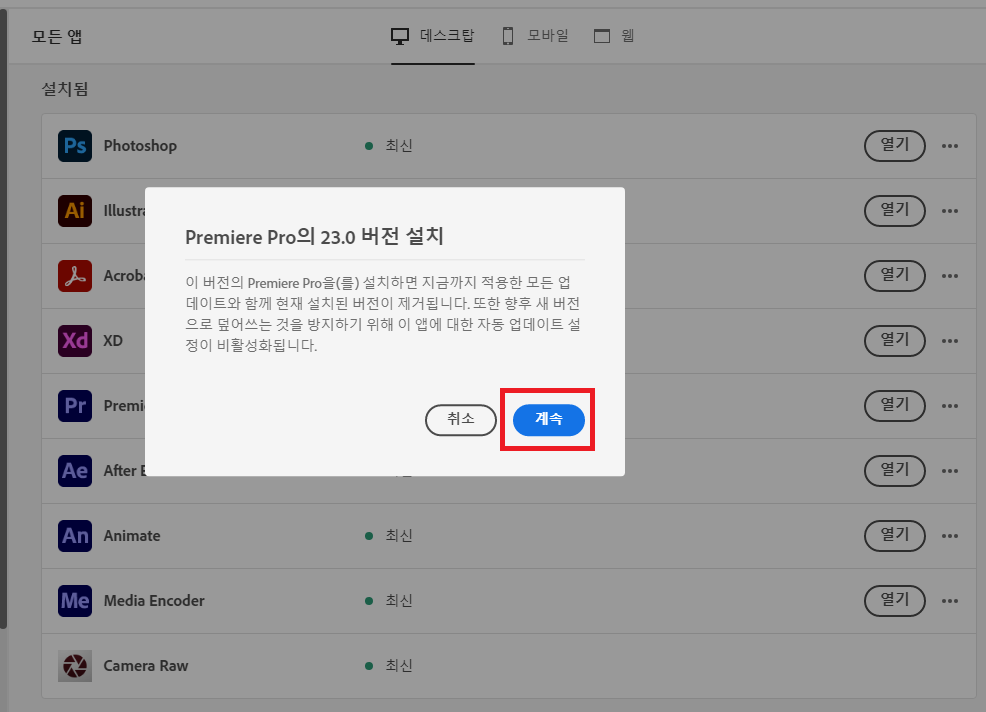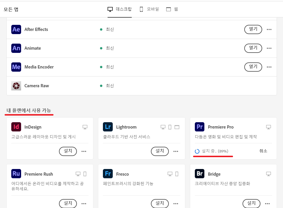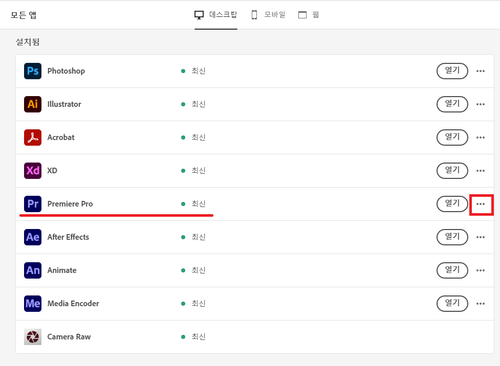 8. 다운그레이드가 모두 완료되었다면 다시 설치됨에 Premiere Pro가 표시되고
