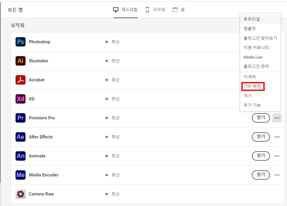 4. 추가 메뉴가 열렸다면 기타 버전을 눌러 이전 버전 리스트를 확인해줍시다.