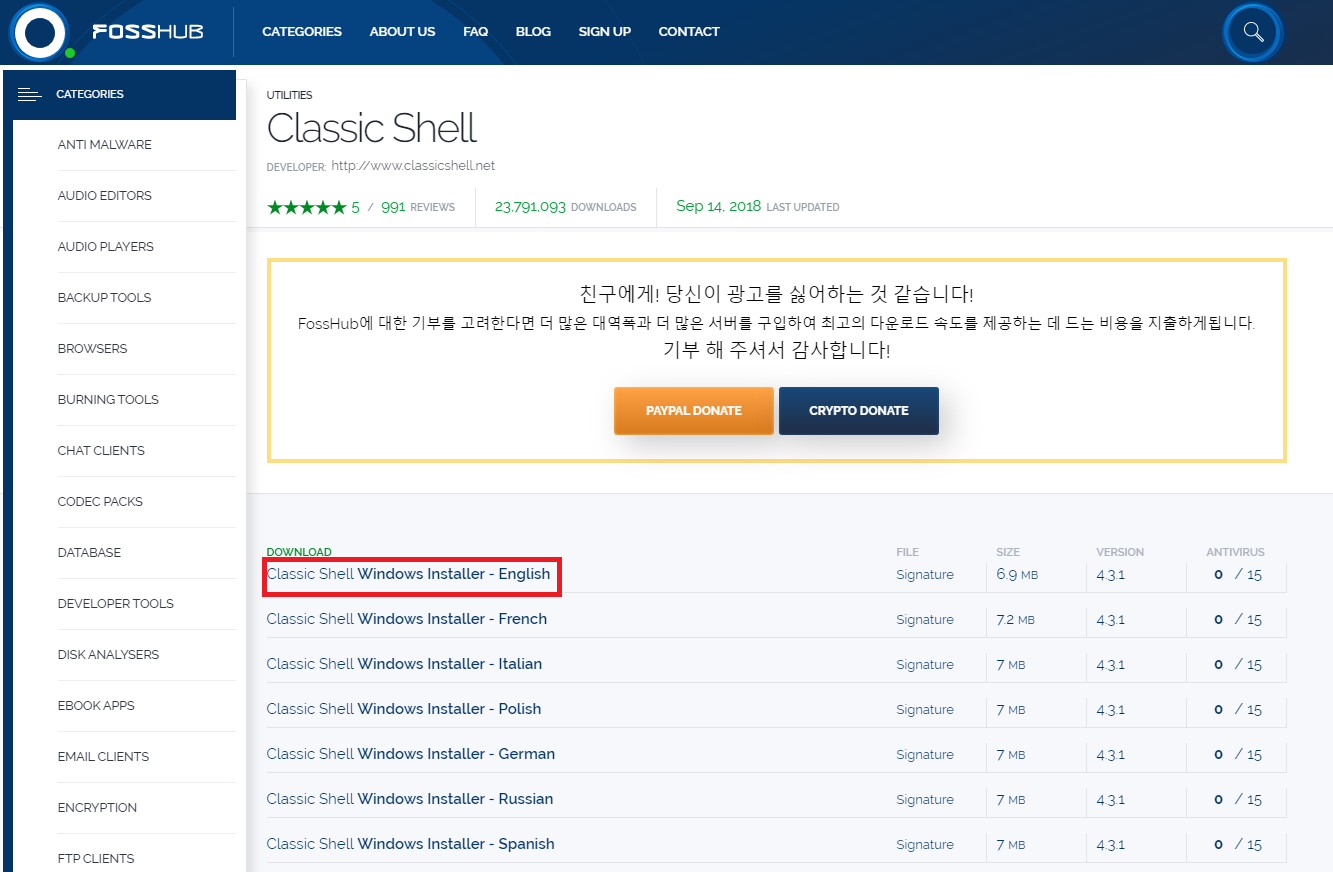 Classic Shell Windows Installer - English 을 클릭해서 다운로드 받아줍시다.