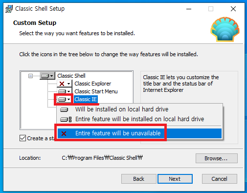 Classic Explorer와 동일하게 Entire feature will be unavailable을 선택해줍시다.