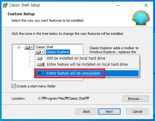 Classic Explorer와 동일하게 Entire feature will be unavailable을 선택해줍시다.
