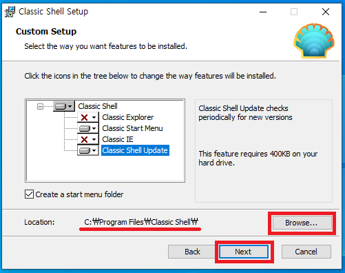 Classic Start Menu 빼고 Explorer나 IE는 설치 제외 해줍시다.