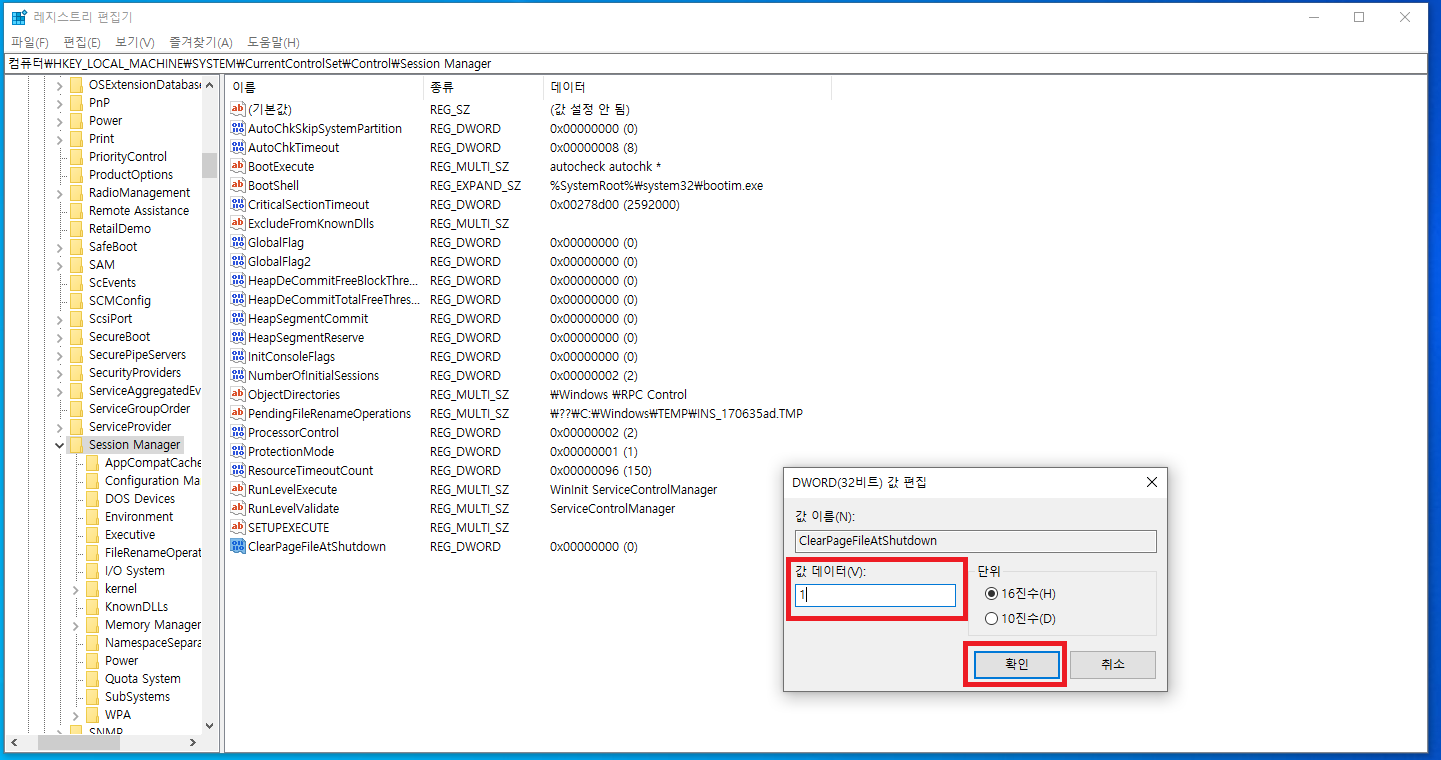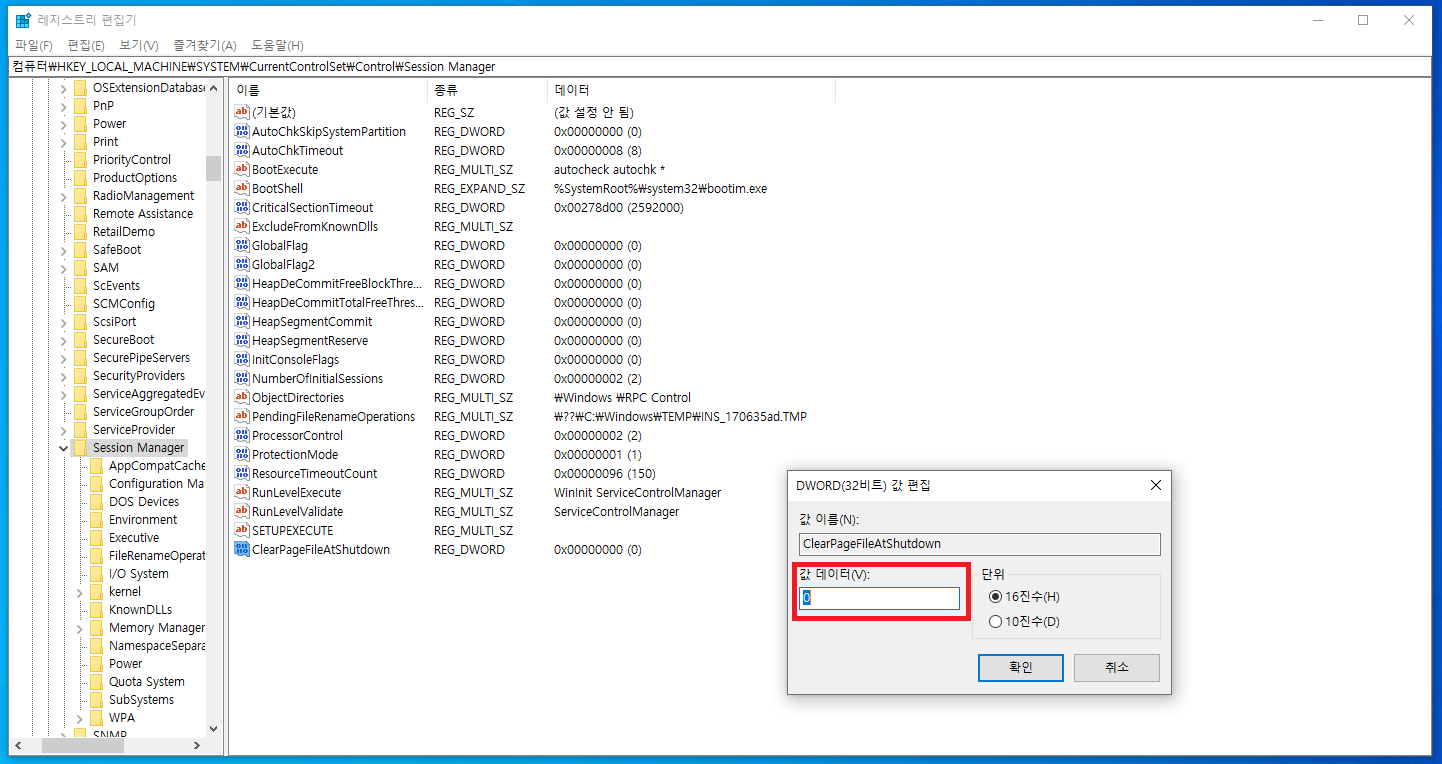 ClearPageFileAtShutdown 항목을 더블클릭하면 위와 같이 값 편집 창이 뜹니다.