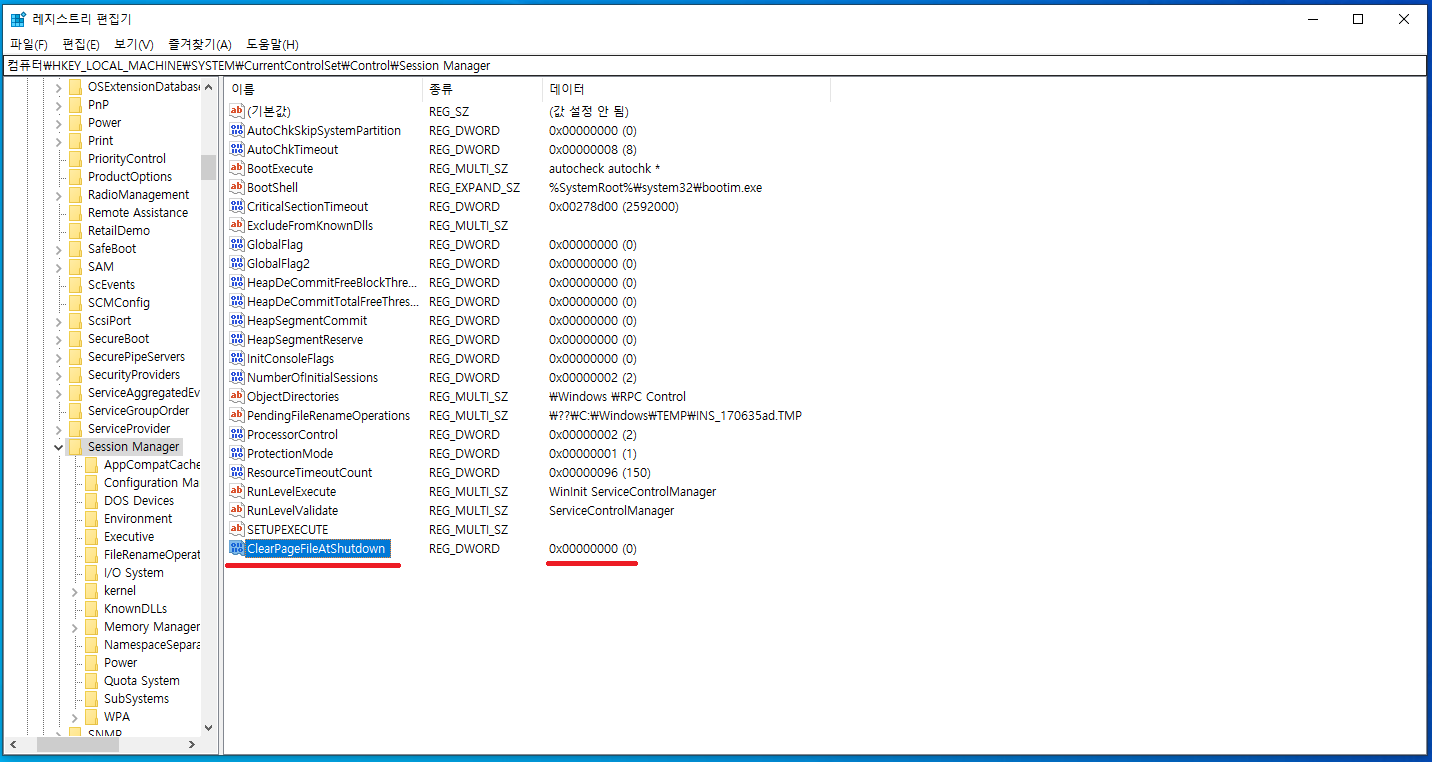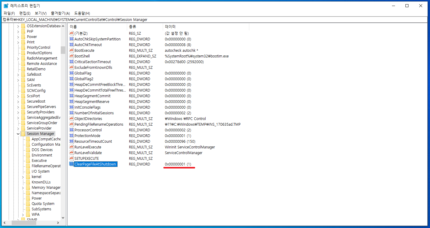 새 키값이 ClearPageFileAtShutdown 으로 변경되었다면 데이터값이 현재 0으로 되어있기 때문에