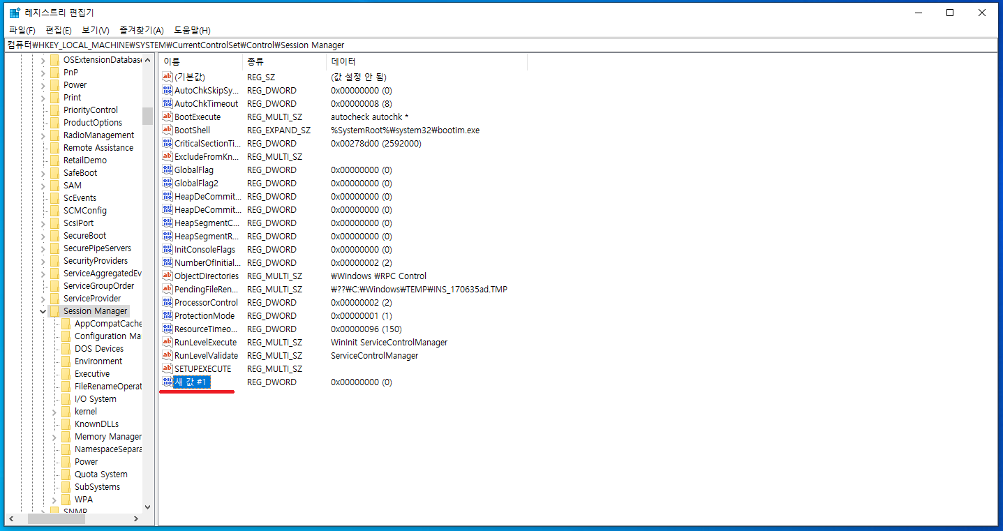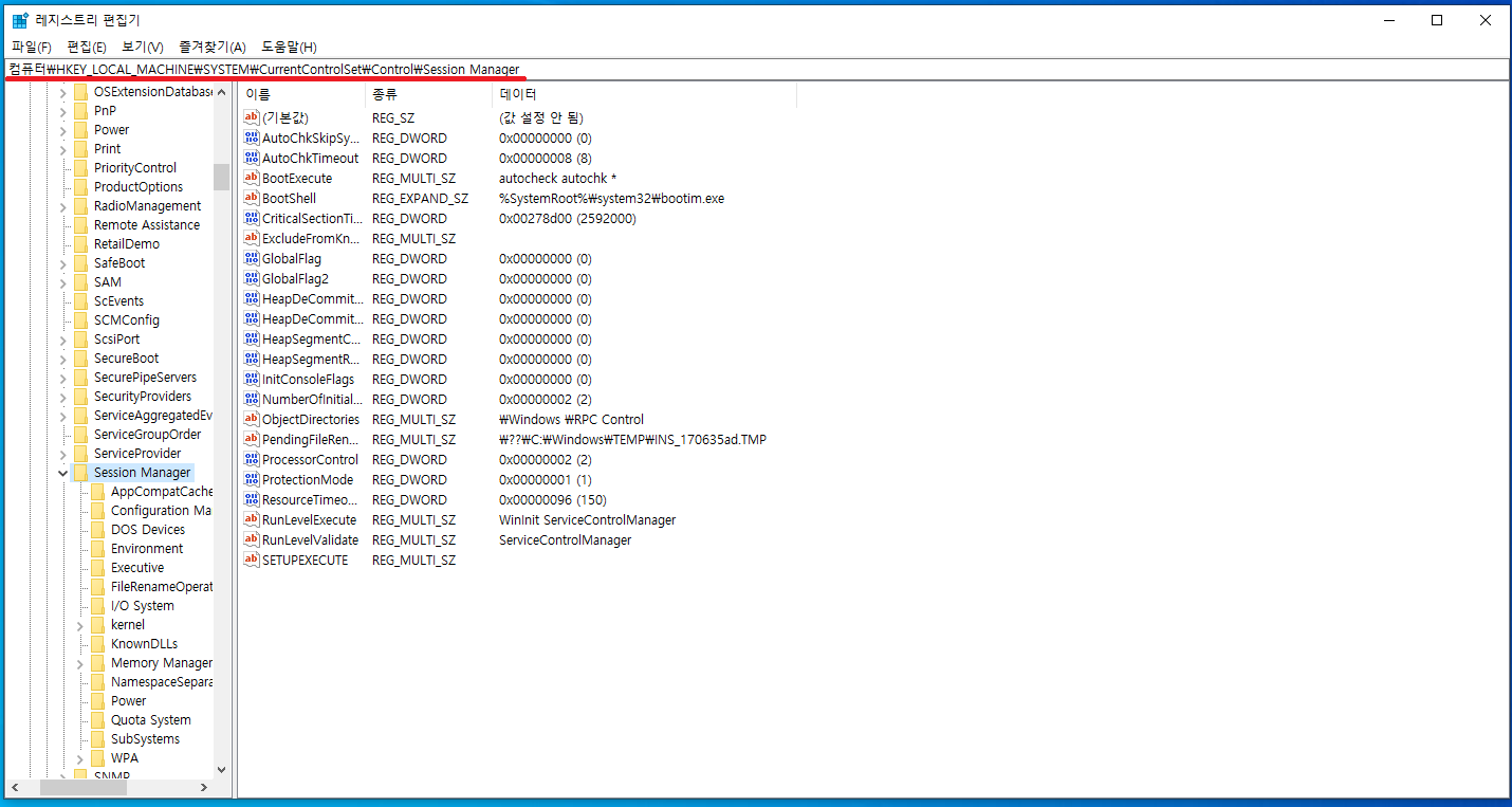 HKEY_LOCAL_MACHINE\SYSTEM\CurrentControlSet\Control\Session Manager 를 입력해주시거나