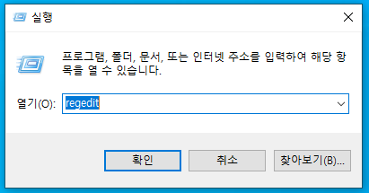 실행창에서 regedit를 입력하고 확인을 눌러주세요.