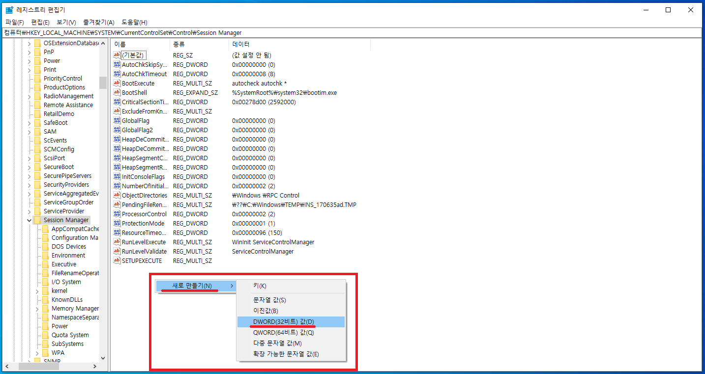 Session Manager 까지 들어왔다면 빈공간에 우클릭하고 새로만들기 > DWORD(32비트) 값을 클릭해 줍시다.