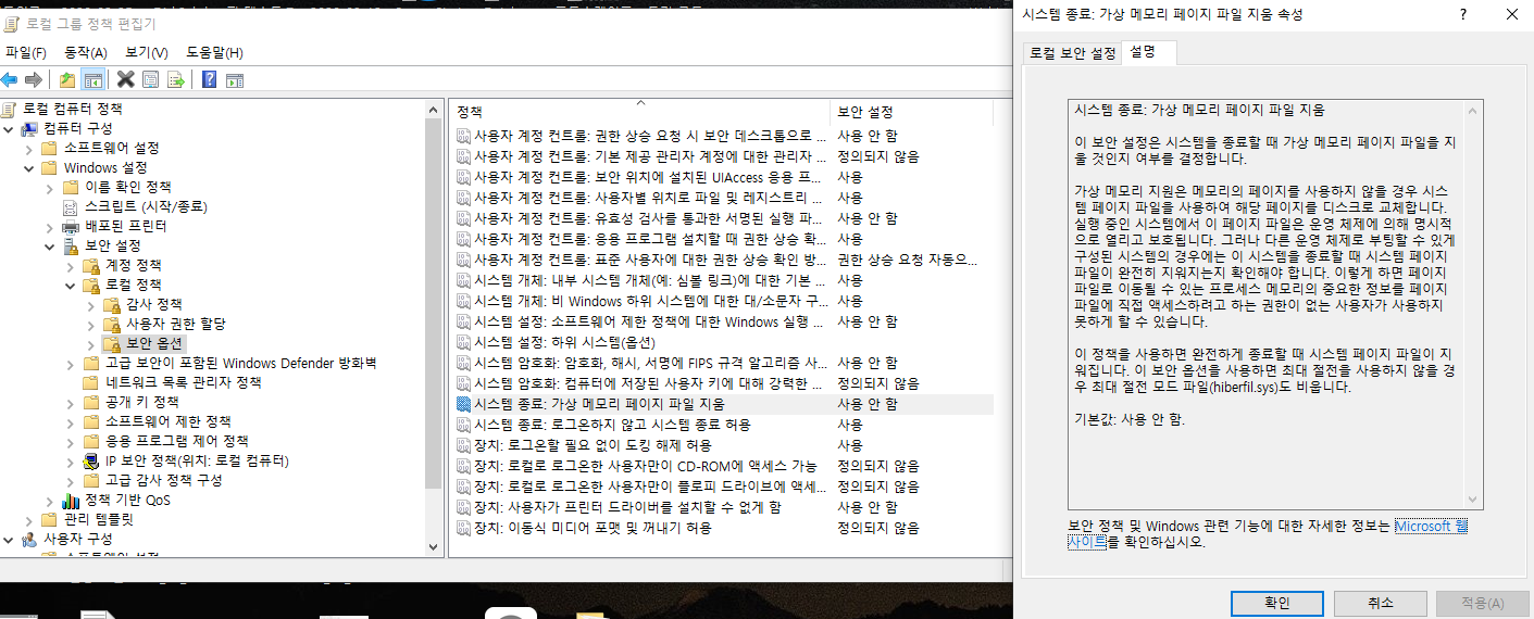 윈도우10 컴퓨터 종료 시 가상 메모리 페이지 파일 지우기