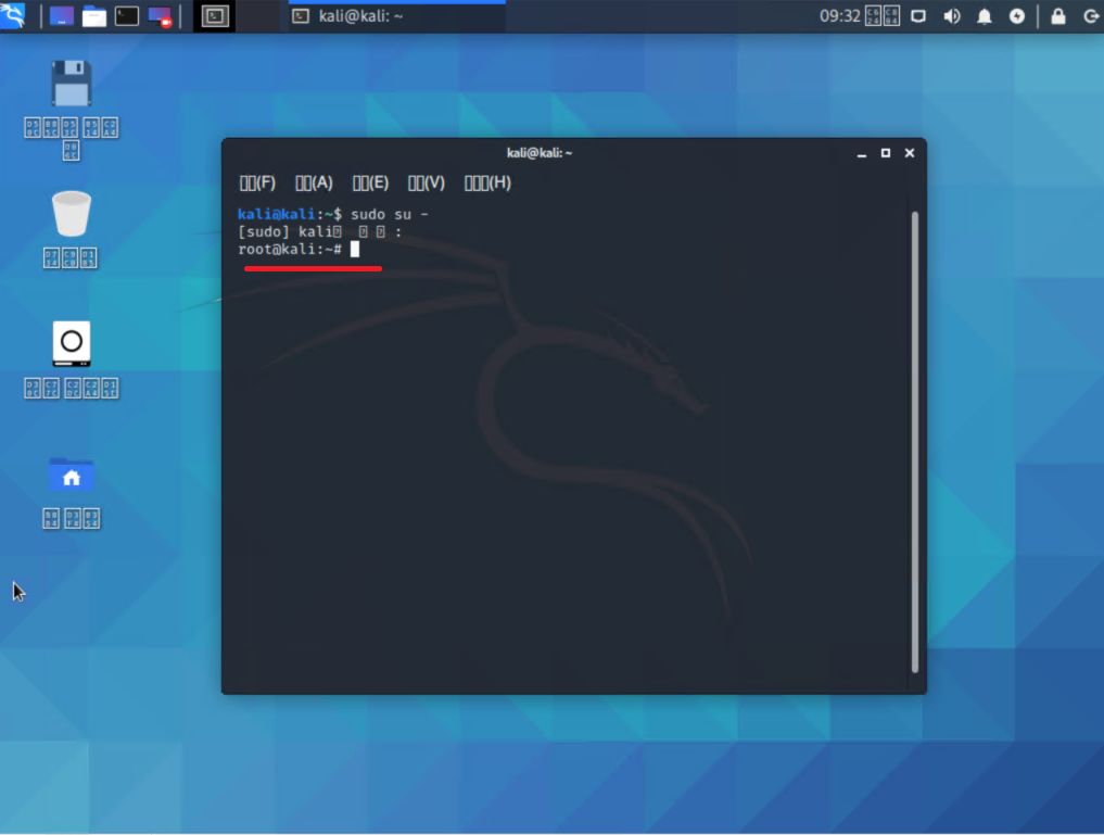5. kali 계정의 비밀번호를 입력하고 엔터를 누르면 위와 같이 kali@kali로 표시되던 계졍명이 root@kali로 변경되셨을 겁니다.