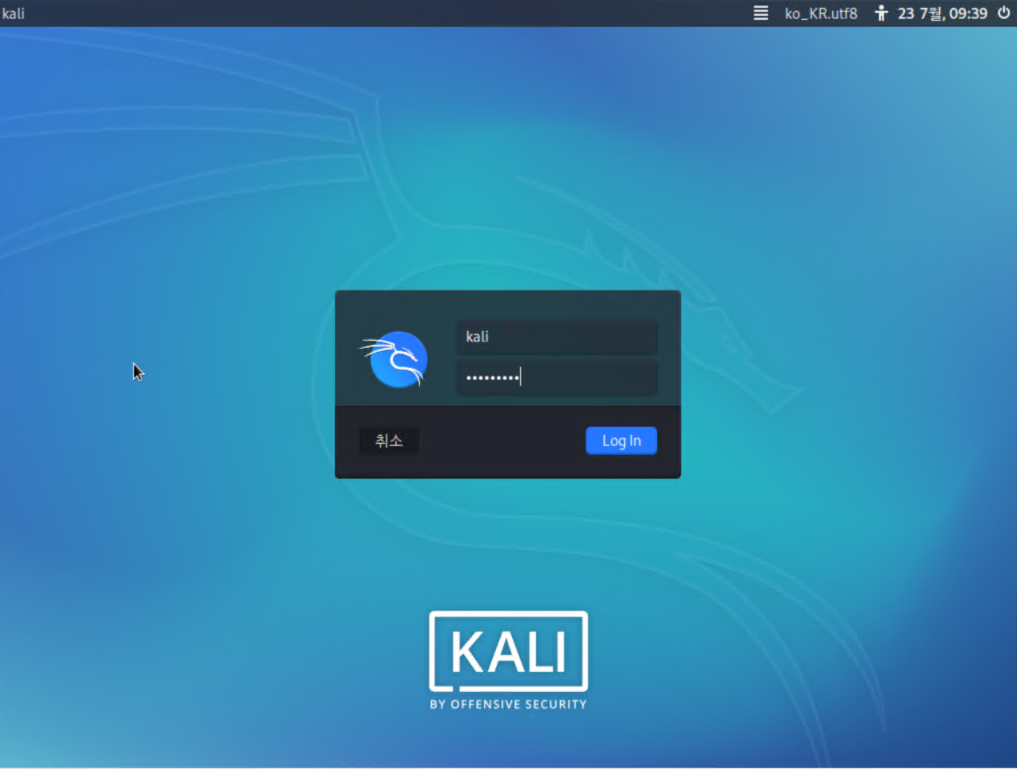 10. 재부팅이 되었다면 kali 계정으로 다시 로그인 해줍시다.