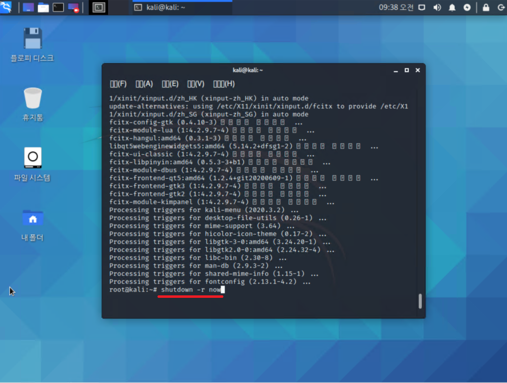9. 재부팅을 하지 않아도 한글이 인식되는것으로 보이나 혹시나 하는 마음에 재부팅도 한번 진행해줍니다.