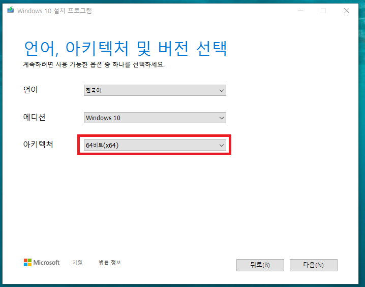 11. 윈도우10 아키텍처를 선택할 수 있는 창이 뜹니다.
