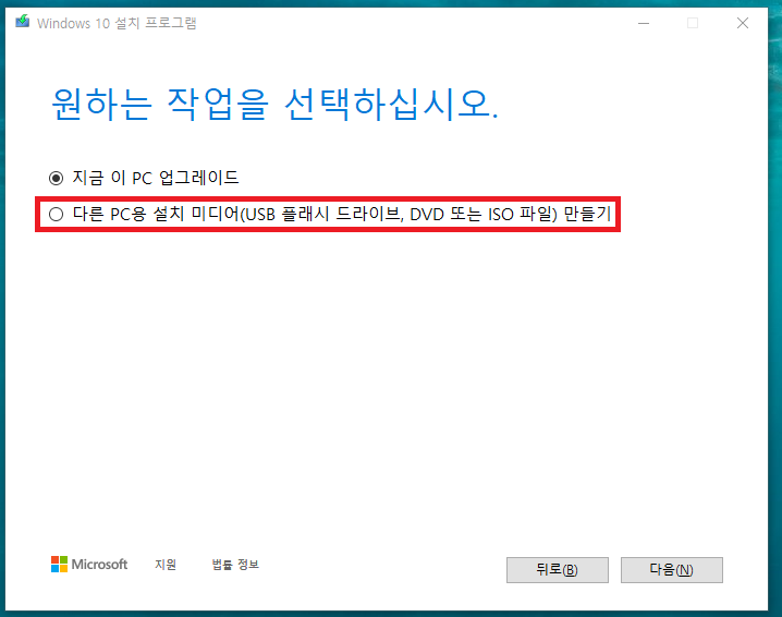 10. 다른 PC용 설치 미디어 만들기를 선택하시고 다음 버튼을 눌러주세요.