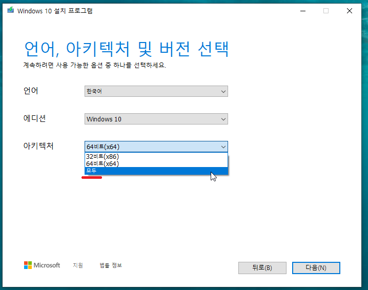 12. 저는 32비트, 64비트 모두 포함된 ISO를 다운로드 받기 위해 아키텍처를 모두로 변경하겠습니다.