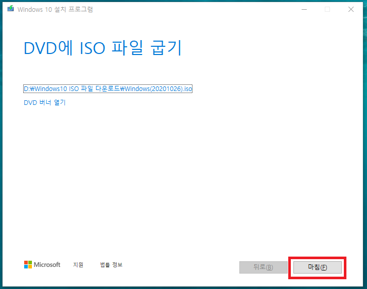 Windows 10용 ISO 파일을 다운로드한 경우, 해당 파일은 선택한 위치에 로컬로 저장됩니다.컴퓨터에 타사 DVD 굽기 프로그램이 설치되어 있으며 해당 프로그램을 사용하여 설치 DVD를 만들려는 경우,