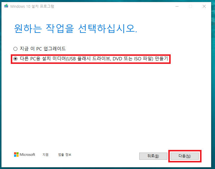 10. 다른 PC용 설치 미디어 만들기를 선택하시고 다음 버튼을 눌러주세요.