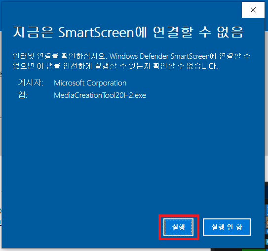 5. 엇 저는 SmartScreen을 사용할 수 없는 상태에서 다운로드가 되었는지 위와 같은 경고창이 떳습니다.