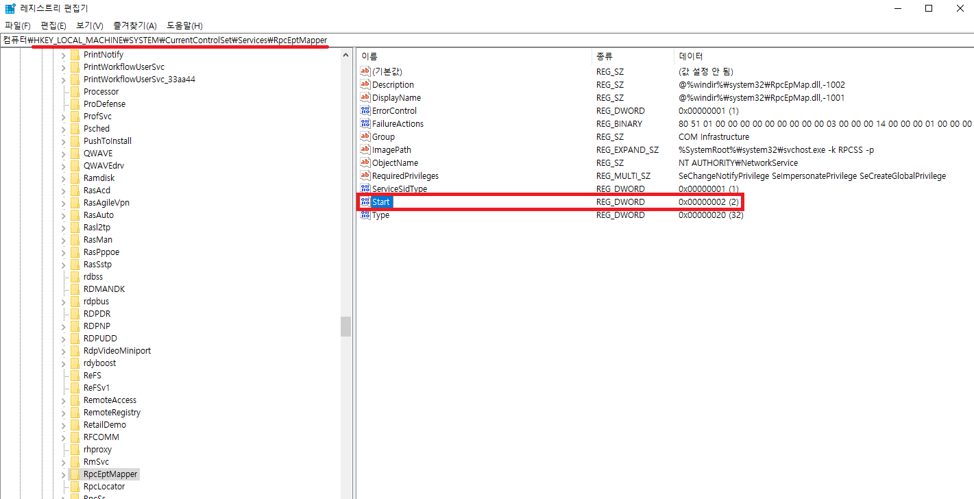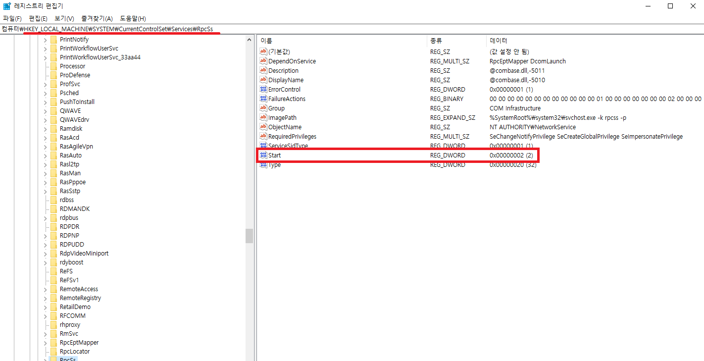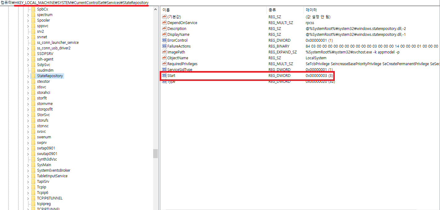 3. 서비스를 강제로 실행시키기 위해 레지스트리를 수정해야합니다.