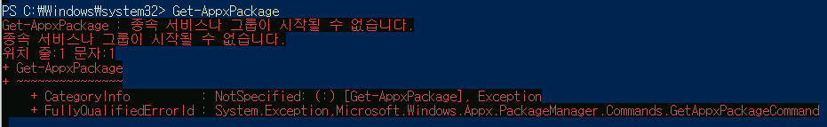 Get-AppxPackage : 종속 서비스나 그룹이 시작될 수 없습니다.
