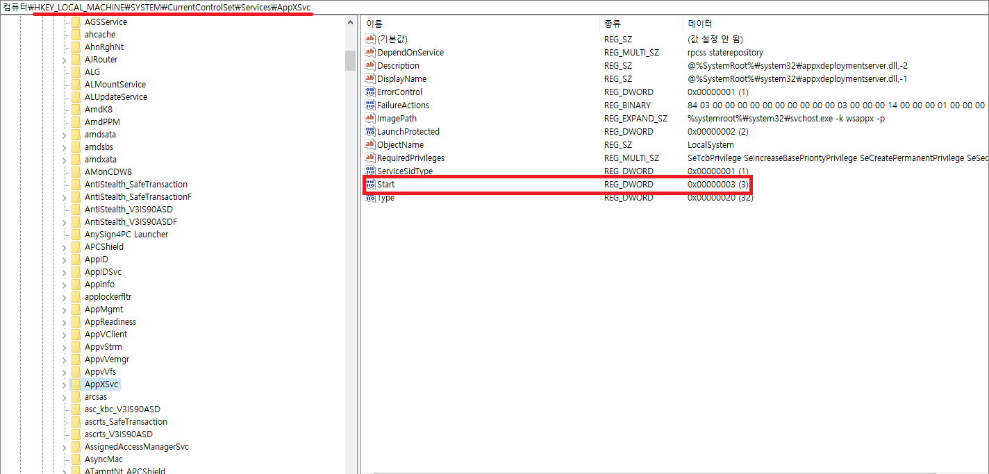 위 서비스가 사용안함이 아닌 자동 및 수동값으로 되어있으면 AppXSVC 서비스를 구동할 수 있습니다.