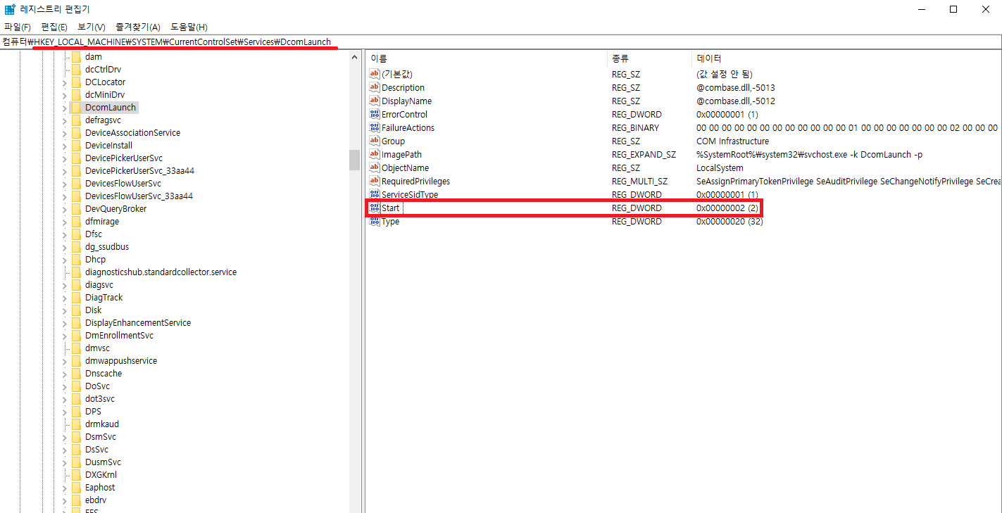 5. HKEY_LOCAL_MACHINE\SYSTEM\CurrentControlSet\Services\DcomLaunch 로 접근하면