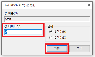 Start라는 항목을 더블 클릭하면 아래 와 같은 값 편집 창이 뜹니다.