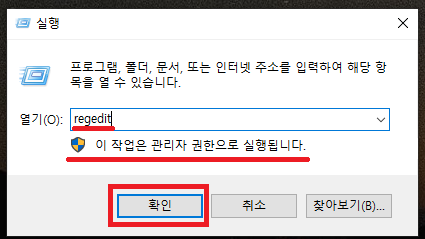 주의! 레지스트리 수정은 관리자 권한이 필요한 작업이므로 관리자 권한이 있는 계정으로 실행해야합니다.
