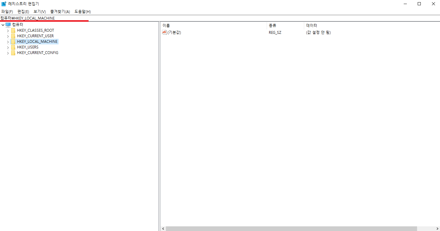 4. 위와 같이 레지스트리가 실행되었다면 레지스트리의 주소표시줄에 경로를 입력해줍니다.