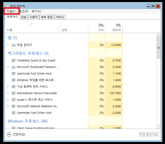 위 메뉴에서 방향키로 작업 관리자를 선택해줍시다.