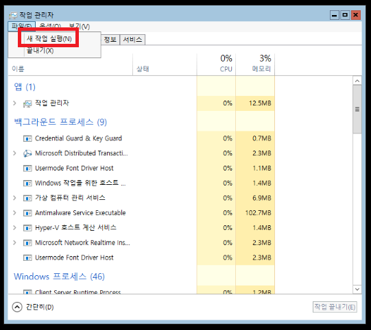 5. 파일 메뉴에서 새 작업 실행을 눌러주세요.