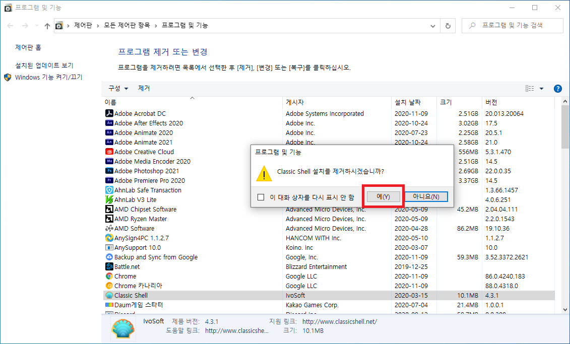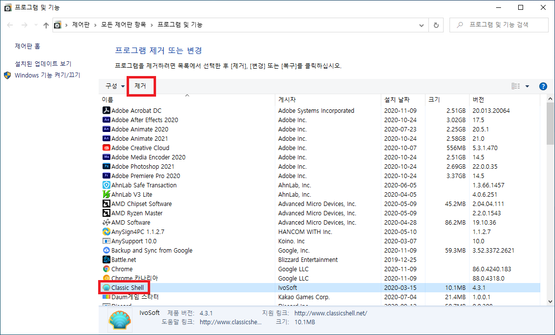 5. Classic Shell 프로그램을 선택하면 상단에 제거 버튼이 활성화됩니다.