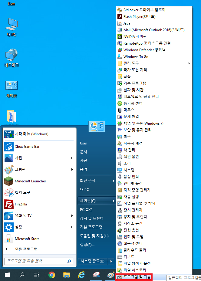 3. 제어판 메뉴에서 프로그램 및 기능을 선택합니다.