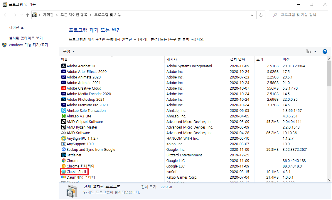 4. 위와 같이 프로그램 및 기능창이 뜨면 Classic Shell이라는 이름을 찾아서 클릭해줍니다.