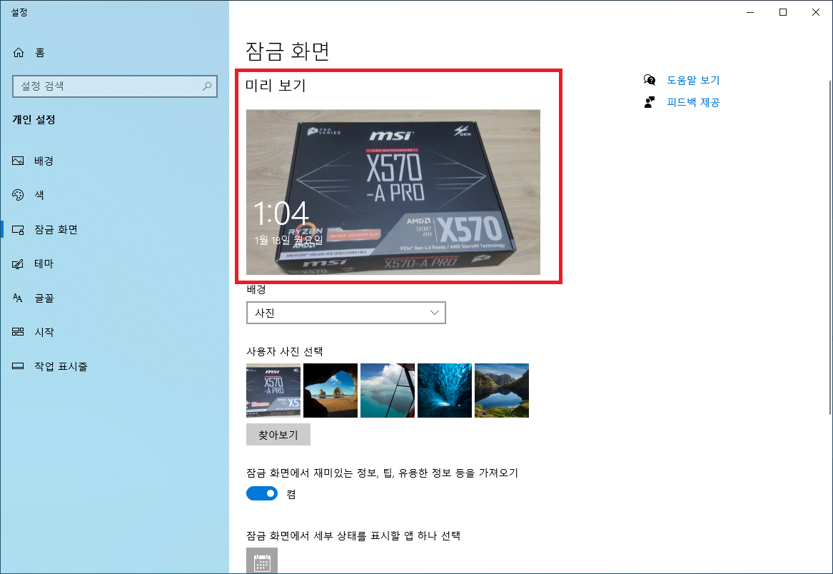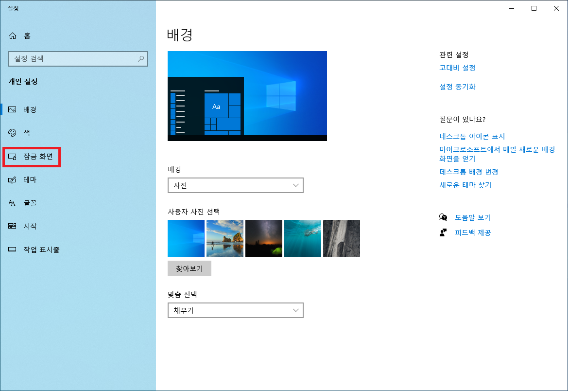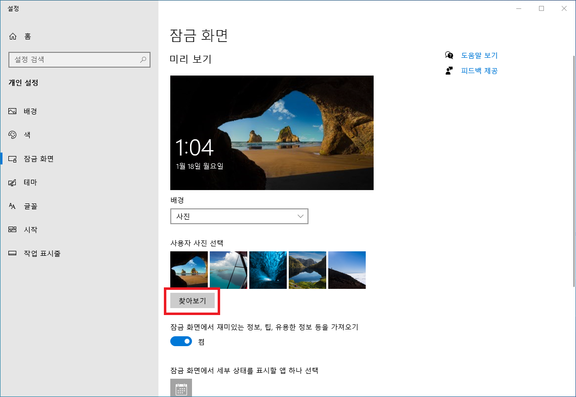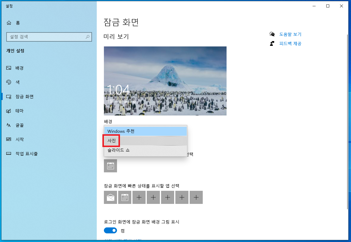윈도우10 잠금화면 배경 설정