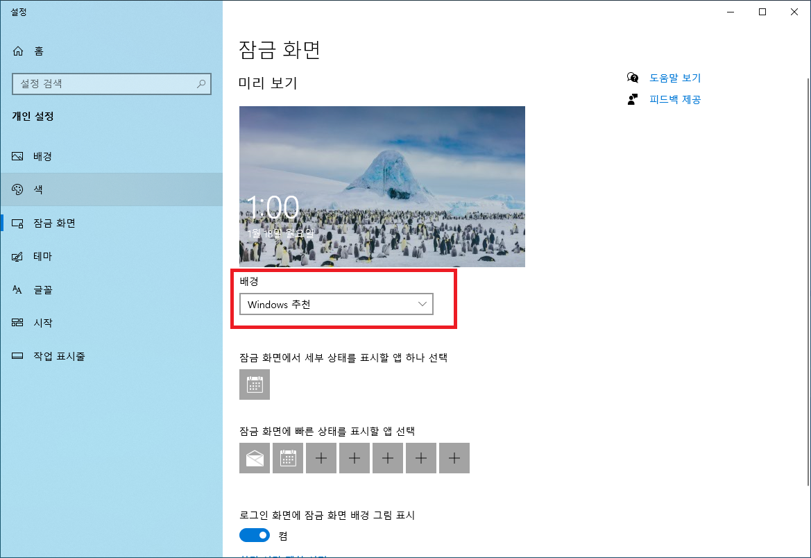 기본값은 Windows 추천이라서 자꾸 이미지가 바뀌는데요